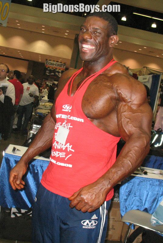 Also on this page are some nice photos of Brian Davies and Paul Baker the 6'2" sometimes 280 lb. black muscleman below. I took those photos of him at LA's Ironman Expo 2008 downtown. I didn't know who he was at the time but he was one of the biggest guys in this crowd of big guys. I took photos of other people walking right up to him but I was too intimidated. And I don't intimidate easily! |